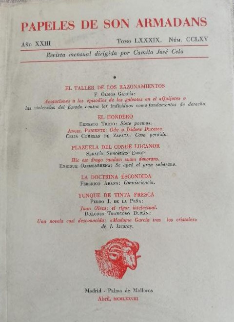 Papeles dee son armadans. Año XXIII TOMO LXXXIX Núm. CCLXV. Abril MCMLXXVIII 96pp